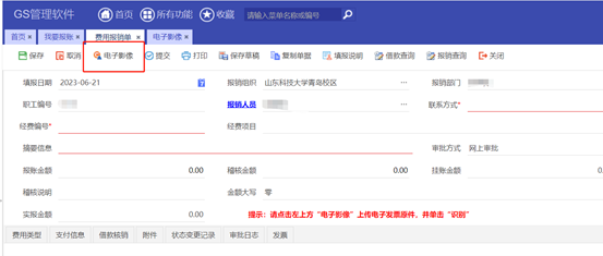 1.电子发票报销需在系统中上传电子版的PDF原件,操作路径是:点击各类报销单“电子影像”,选本地上传或手机上传(其中,手机上传需登录浪潮云+客户端,使用上传影像功能,选择手机中的对应文件),上传成功后,点击“识别”按钮,报销单发票页签将自动读取发票内容,无需手动填写。