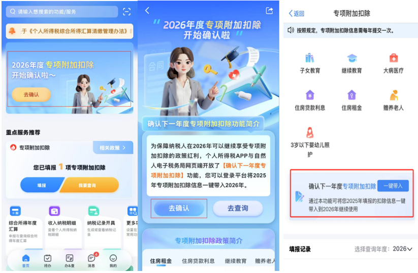 根据国家税务总局相关规定,2026年度个税专项附加扣除信息确认工作已正式启动,事关大家的个税缴纳与实际收入,务必高度重视!请各位教职工于2025年12月31日前在个人所得税APP完成确认。